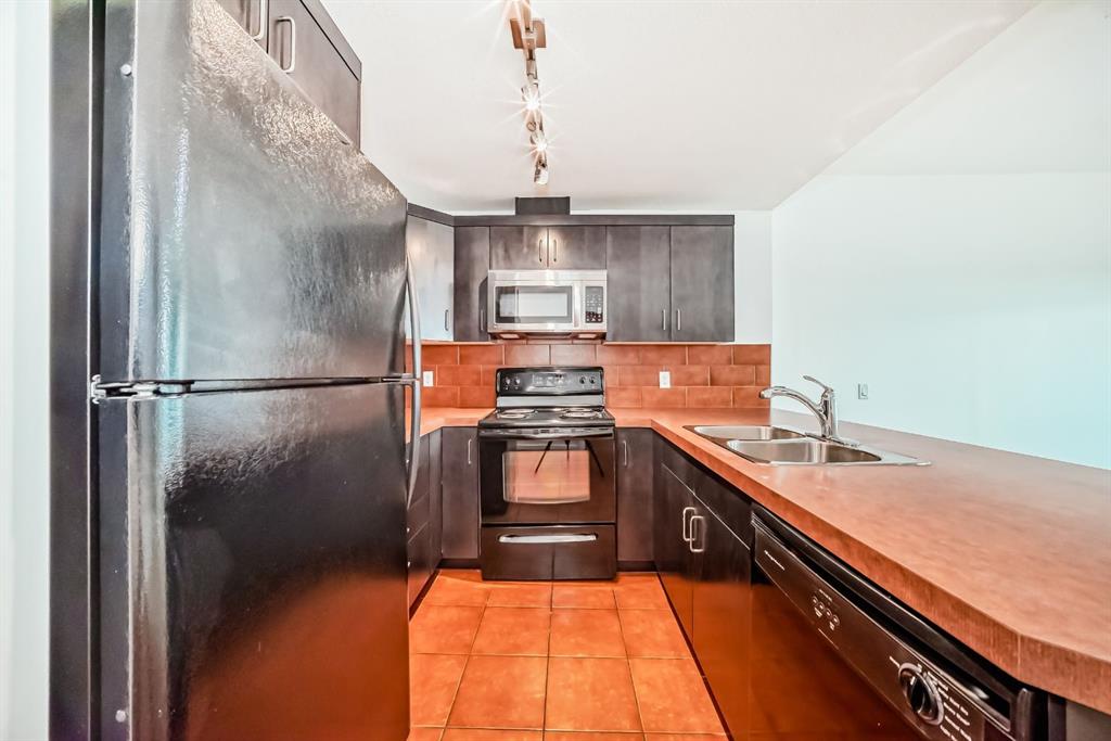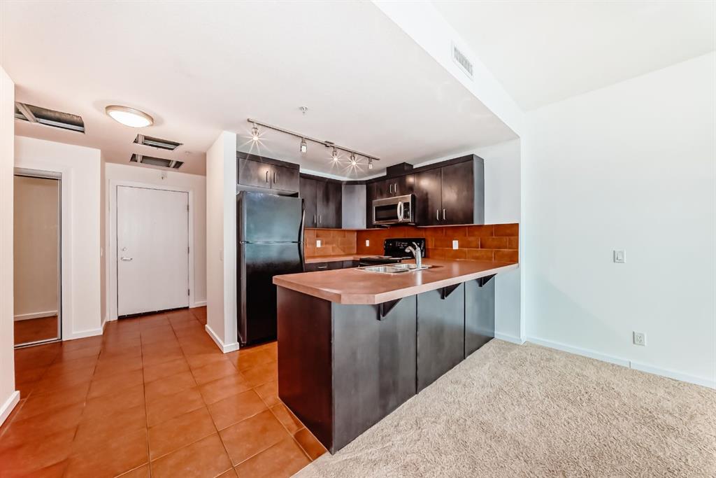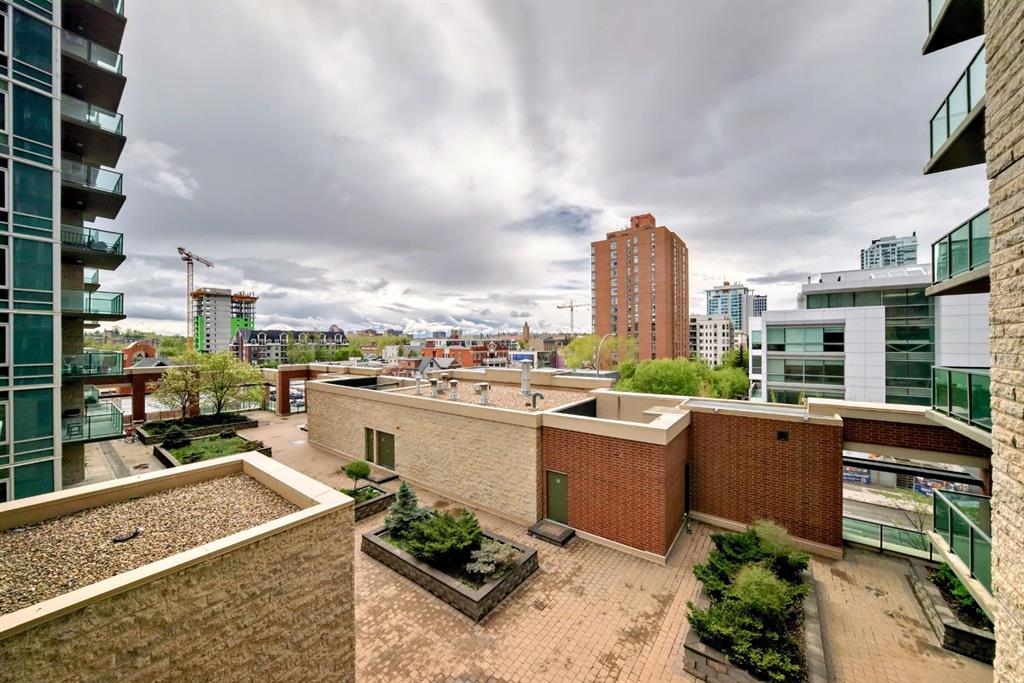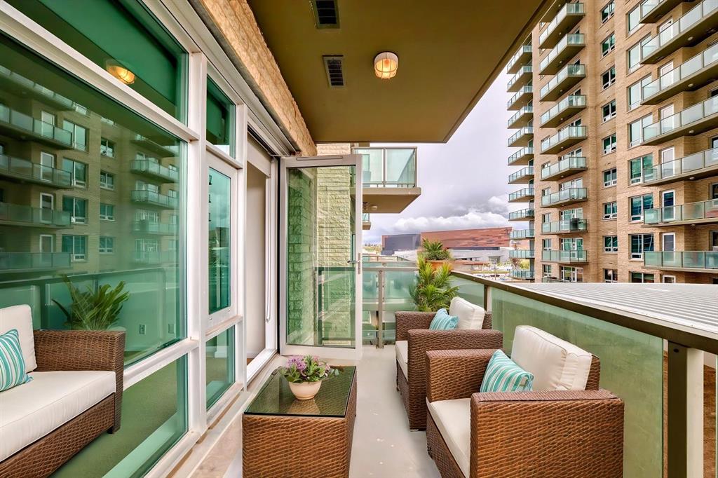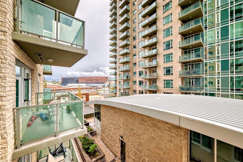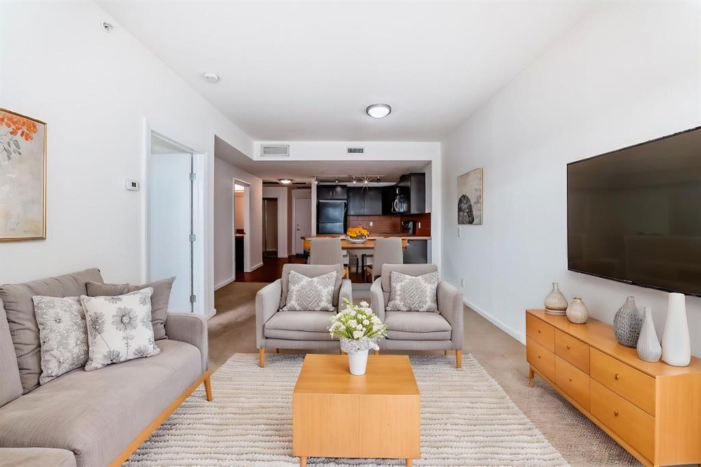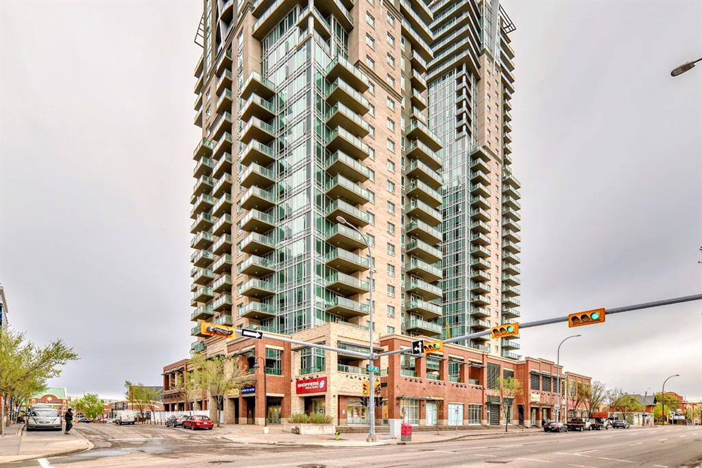 Welcome home to this well-maintained southwest facing one bedroom plus den condo boasting almost 700 square feet of living space nestled in Calgary’s vibrant Beltline district. Sasso is steps away from the Stampede LRT Station and just a short walk to the Stampede Grounds, BMO Centre, Saddledome, Sunterra Market, H-mart and the bustling 17th Avenue SW. Shoppers Drug Mart is conveniently located at the base of the building, while the nearby Bow River pathways, tennis courts, and Theatre District offer ample opportunities for outdoor activities. This condo offers an open-concept layout featuring 9-foot ceilings and floor-to-ceiling windows that flood the space with natural light. Central air conditioning ensures year-round comfort, while the spacious bedroom boasts a walk-through closet leading to a full ensuite bathroom. The kitchen is equipped with ample cabinet storage and a breakfast bar, perfect for casual dining. Adjacent dining and living areas open to a roomy deck with a BBQ gas line, ideal for hosting or simply enjoying the downtown views. Sasso is an 18+ building and offers an amenity-rich lifestyle, including a building concierge, a fully equipped fitness center with cardio and weights, a hot tub, theatre room and a games room with a pool table. This condo has been freshly painted and comes complete with a titled parking stall in the heated underground parkade with visitor parking and an assigned storage locker. Call today for your private showing!